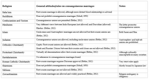 Views of main religions towards consanguineous marriages. NB: Where first-cousin marriages are allowed, lower levels of consanguinity are also allowed. Image Source: Copy-pasted from my own PhD thesis