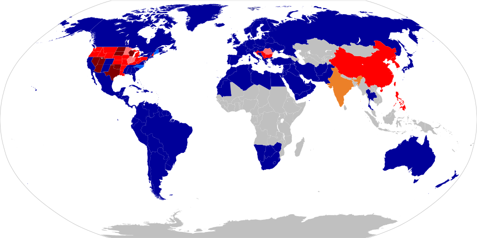 Laws regarding first-cousin marriage around the world. Navy blue: First-cousin marriage legal. Light Blue: Allowed with restrictions or exceptions. Yellow: Legality dependent on religion or culture. Red: Statute bans first-cousin marriage. Pink: Banned with exceptions. Dark Red: Criminal offense. Grey: No available data. The image has been released into the public domain by the author (URL: http://en.wikipedia.org/wiki/Cousin_marriage).