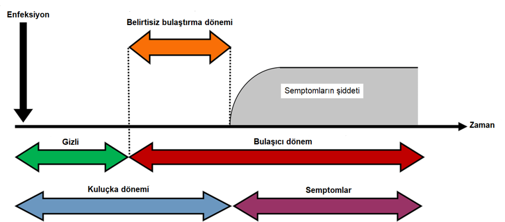 SARS-CoV-2’yi çok ‘sinsi’ yapan özelliklerinden birisi ‘kuluçka’ (Incubation) döneminin uzunluğunun yanı sıra ‘gizli’ (Latent) döneminin de nispeten kısa olması. Bu sayede ‘Belirtisiz bulaştırma’ (Subclinical infectious) dönemi uzuyor ve birçok insan daha semptomları bile başlamadan bulaştırmaya başlıyor. Image adapted from: Arzt et al (2019)