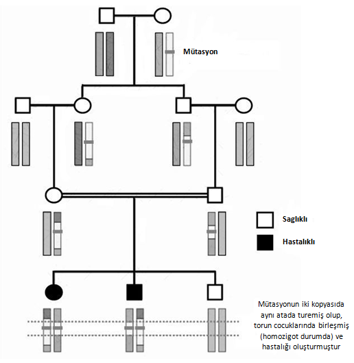 Figür 2: Akraba arasındaki evliliği, akraba olmayanların arasındaki evliliklerden ayıran, aynı mütasyonun iki kopyasının aynı kişide bulusma olasılığının normale nazaran yüksek olmasıdır. Figür 2’de de görüleceği üzere, hastalıklı çocukların buyuk annelerinde oluşan mütasyon torunlarının evlenmesiyle mütasyonun iki kopyasının buluşma olasılığı yükselmiştir (klinik genetikte, böyle aile agaçlarında erkekler kare, kadınlar ise daire ile temsil edilir. Jenerasyonlar ise yukarıdan aşağı doğru ilerler). Iki ebeveynde de aynı mütasyonun bir kopyası olunca, (mütasyonun homozigot durumda olması ve) çocukta hastalık oluşma riski 4’te birdir. Figür: Doktora tezimden)