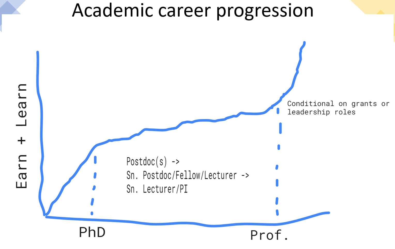 I also want to mention that career progression in UK academia is too slow for my liking (see below figure). I do not want to be treated as an ECR and living ‘paycheck to paycheck’ until I’m 50 – again, I feel like life is too short for this. This is why I wanted to move to a group where I would be respected more but also earning more – so that I can provide a good life for my family whilst fully concentrating on my/the team’s ‘cutting-edge’ research.