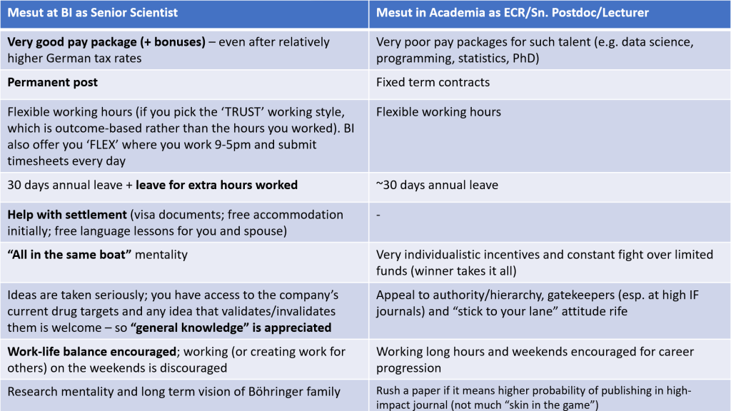 To get back to my views of ‘working for BI v in academia’, I’ve made a summary table below which compares my experience as a Senior Scientist in BI and my time as an ECR/(Sn.) Postdoc/(Prospective) Lecturer in UK academia. I’ve highlighted in bold where I think one side better was than the other for me.